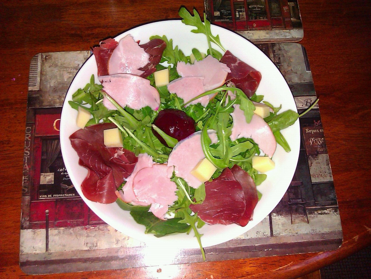 Also made myself a very simple but nutritious salad with rocket leaves, beetroot, Gruyere cheese and cold meats. Mmmm…