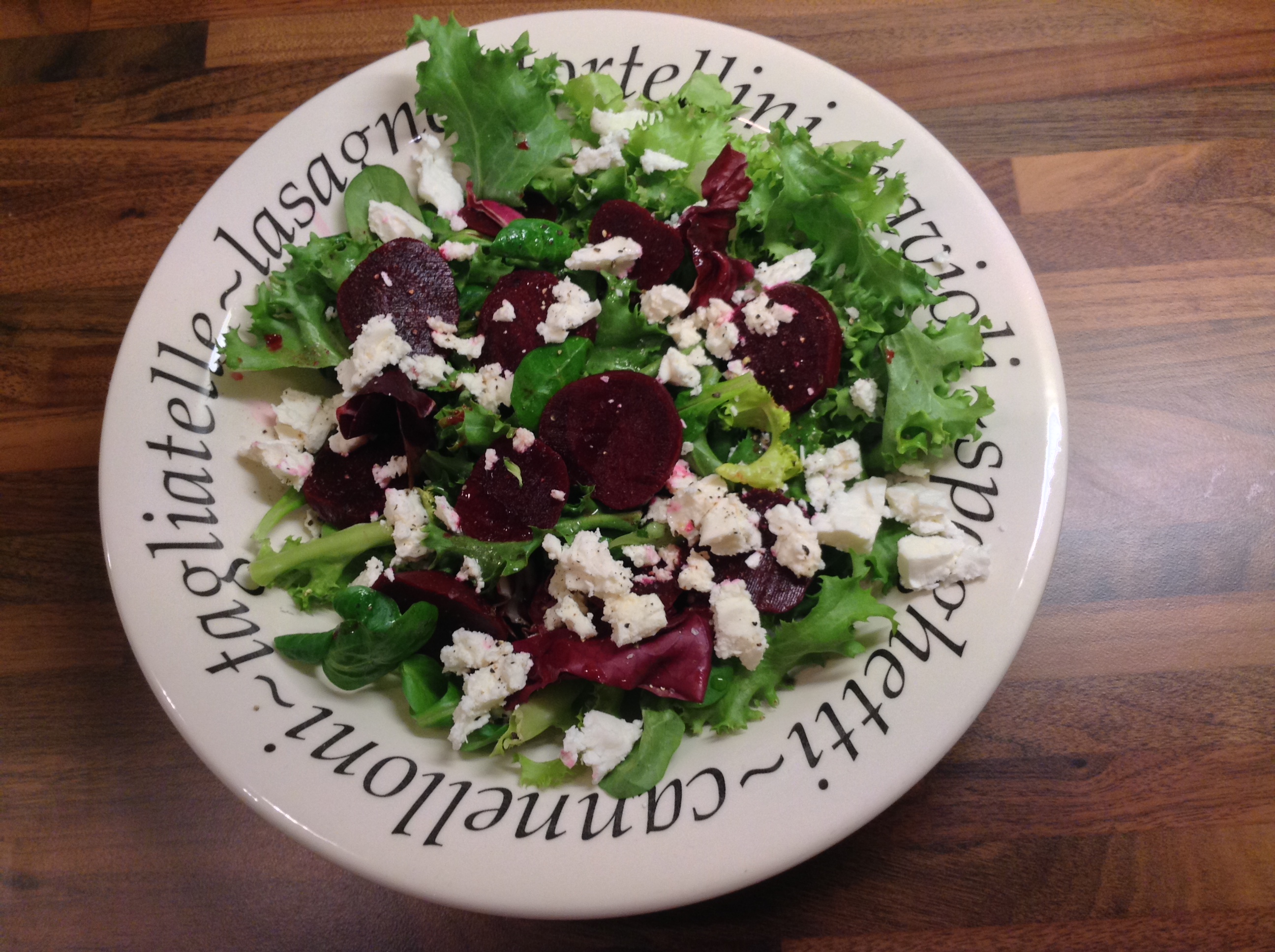 All you need is fresh salad leaves, a few pickled beetroots, about 100g of good quality feta and a dash of olive oil along with a sprinkle of pepper and salt.