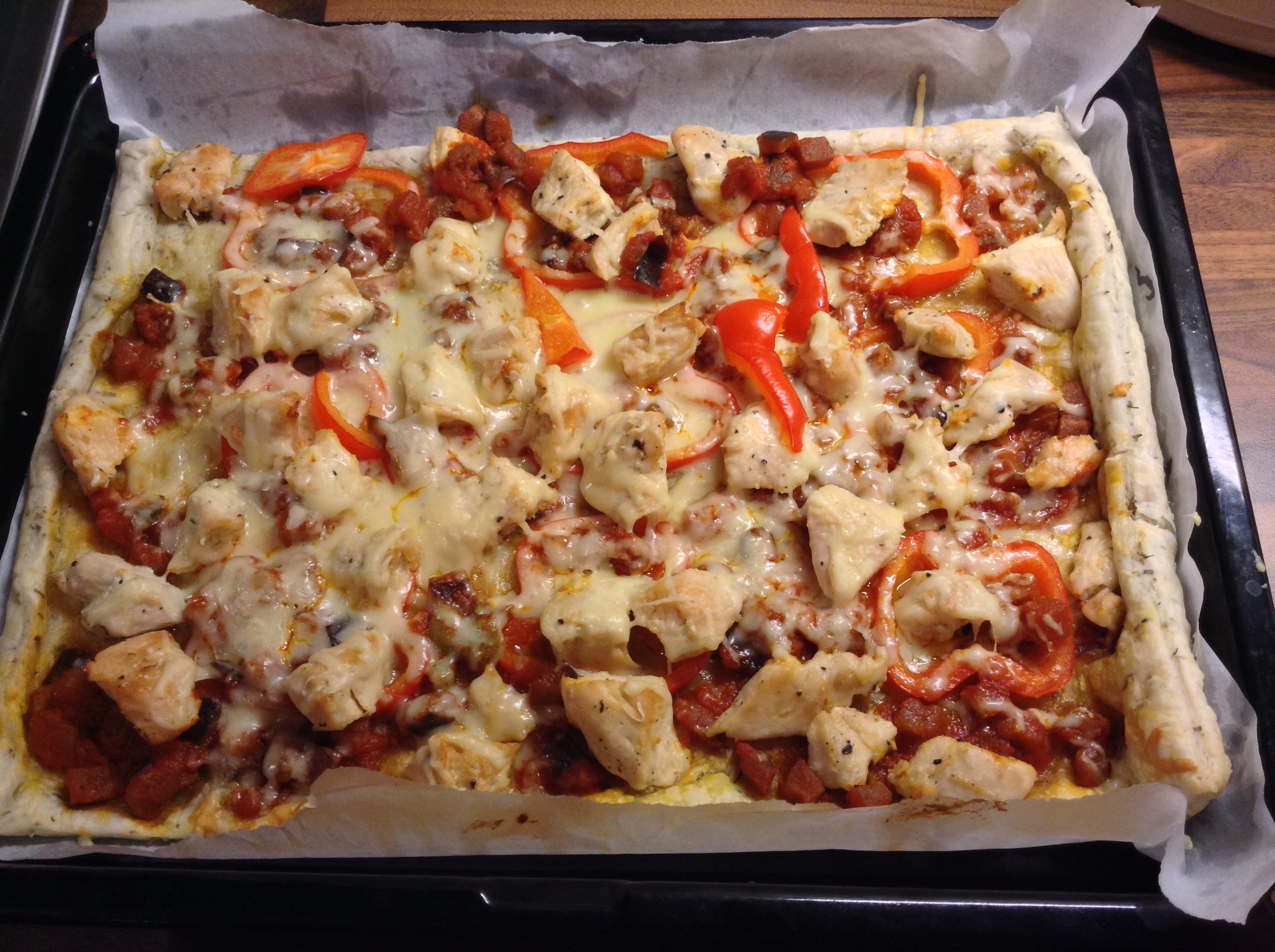 I rolled out my pastry onto a buttered lining sheet, added a drop of olive oil then my Caponata sauce (bought in Home Bargains) and the sliced pepper. The cooked chicken came next and I ended with a sprinkle of freshly grated Cheddar cheese.