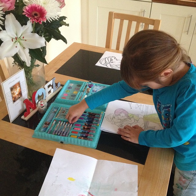 Emma got busy right away with it, as soon as it arrived, and it was declared her favourite and best art set ever :-). We printed some Frozen colouring in pages to start with: