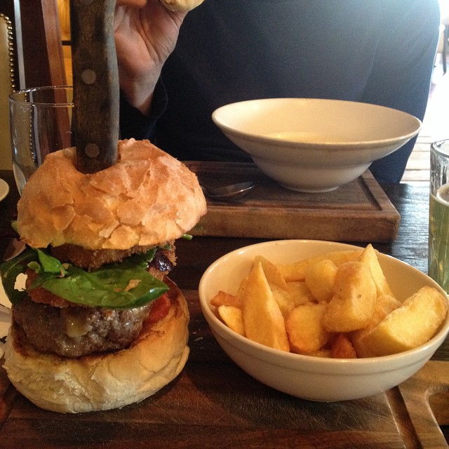 11007933_1540489052879375_1339106863_nThe specials sounded ambiguous for a non-connoisseur like me so Emma and I decided to go for hearty burgers. Alex LOVES fish chowder so he went for that. Plus the house’s lager, which we found light and refreshing: