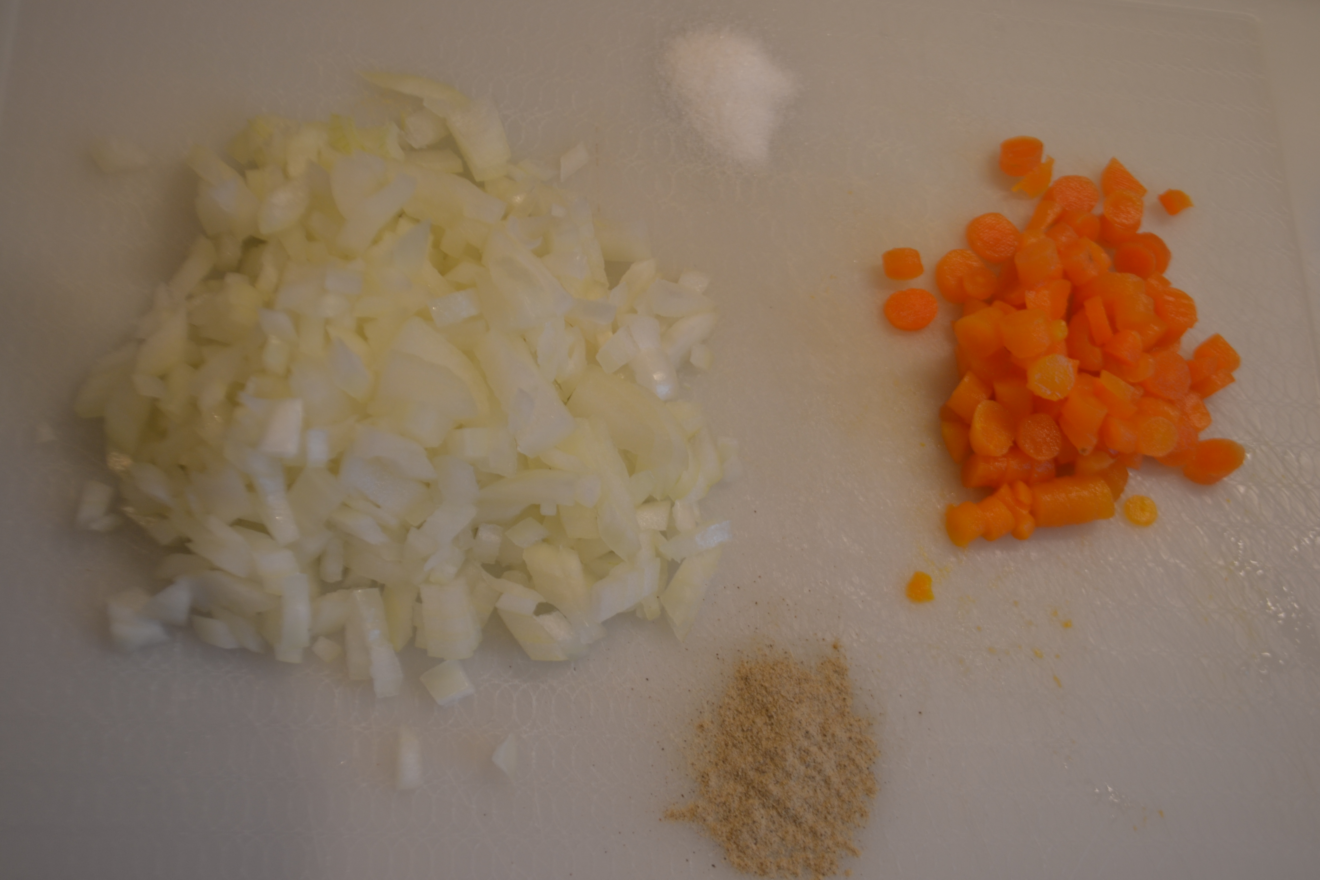 First, I chopped the onion and the carrot and added them to a pan with oil. I needed the onion to soften a bit and the carrot to blend in as a flavour. Salt and pepper went in at the same time and for the same purpose, to season our base, before the beans went in: